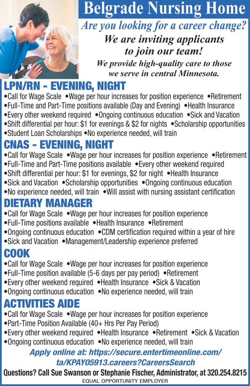 Sep 01, 2024. Belgrade Nursing Home Jobs Ads from Aitkin Independent Age