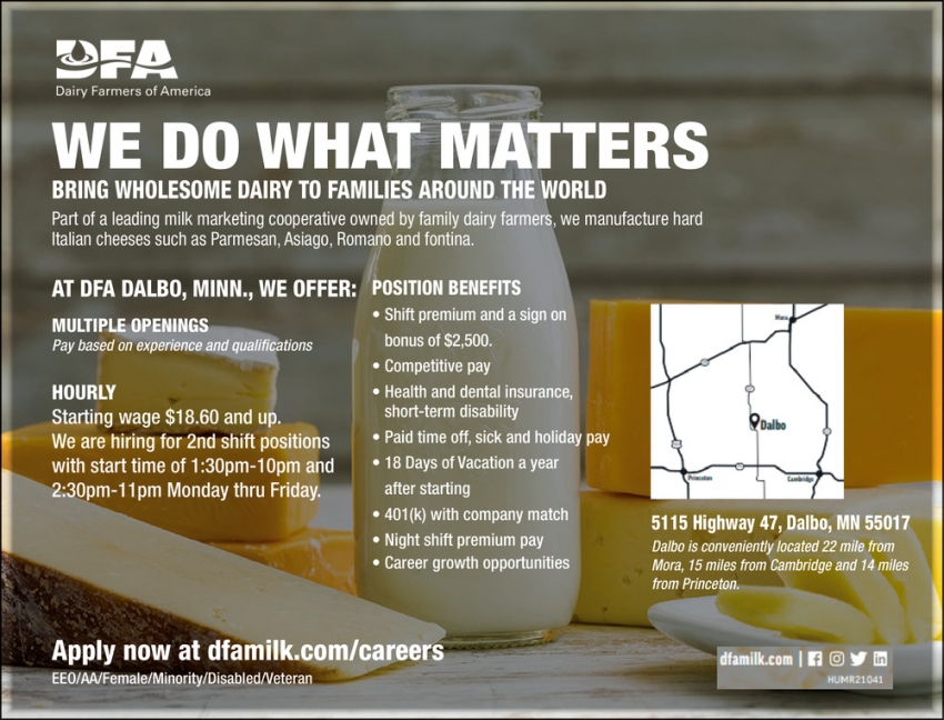 Sep 05, 2024. Dairy Farmers of America Jobs Ads from Aitkin Independent Age