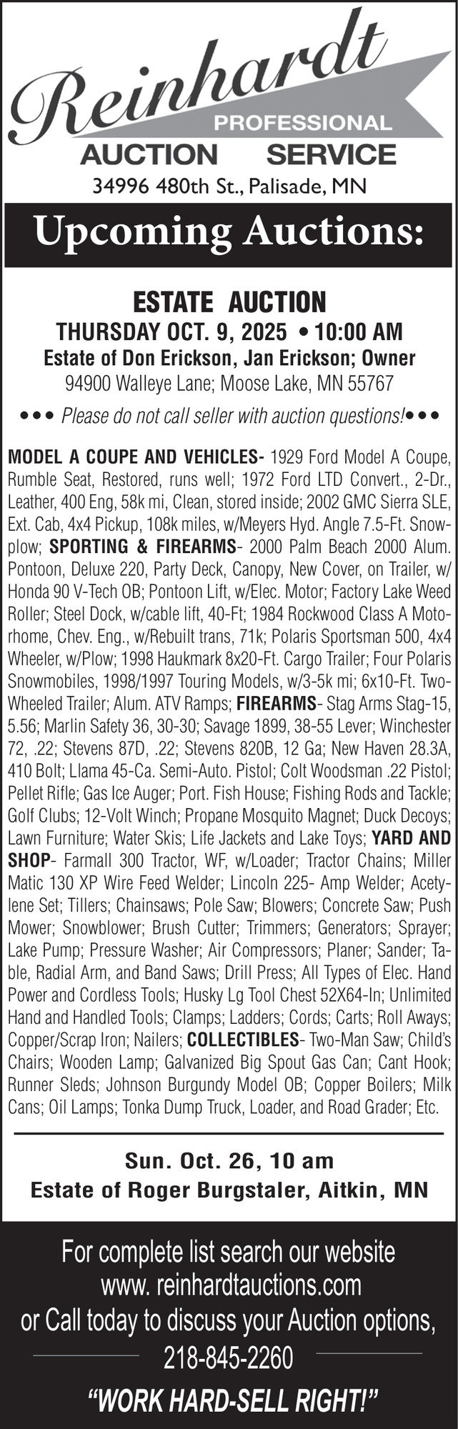 Sep 27, 2025. Reinhardt Auction Service Auction Ads from Aitkin Independent Age