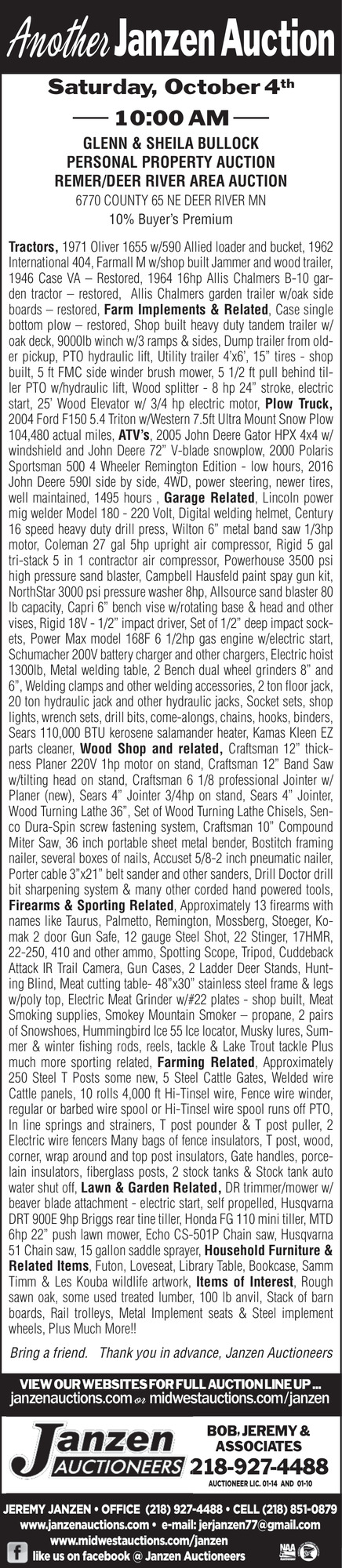 Sep 27, 2025. Janzen Auctioneers Auction Ads from Aitkin Independent Age
