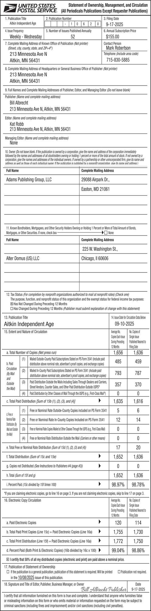 Oct 08, 2025. United States Postal Service Print & Advertising Ads from Aitkin Independent Age