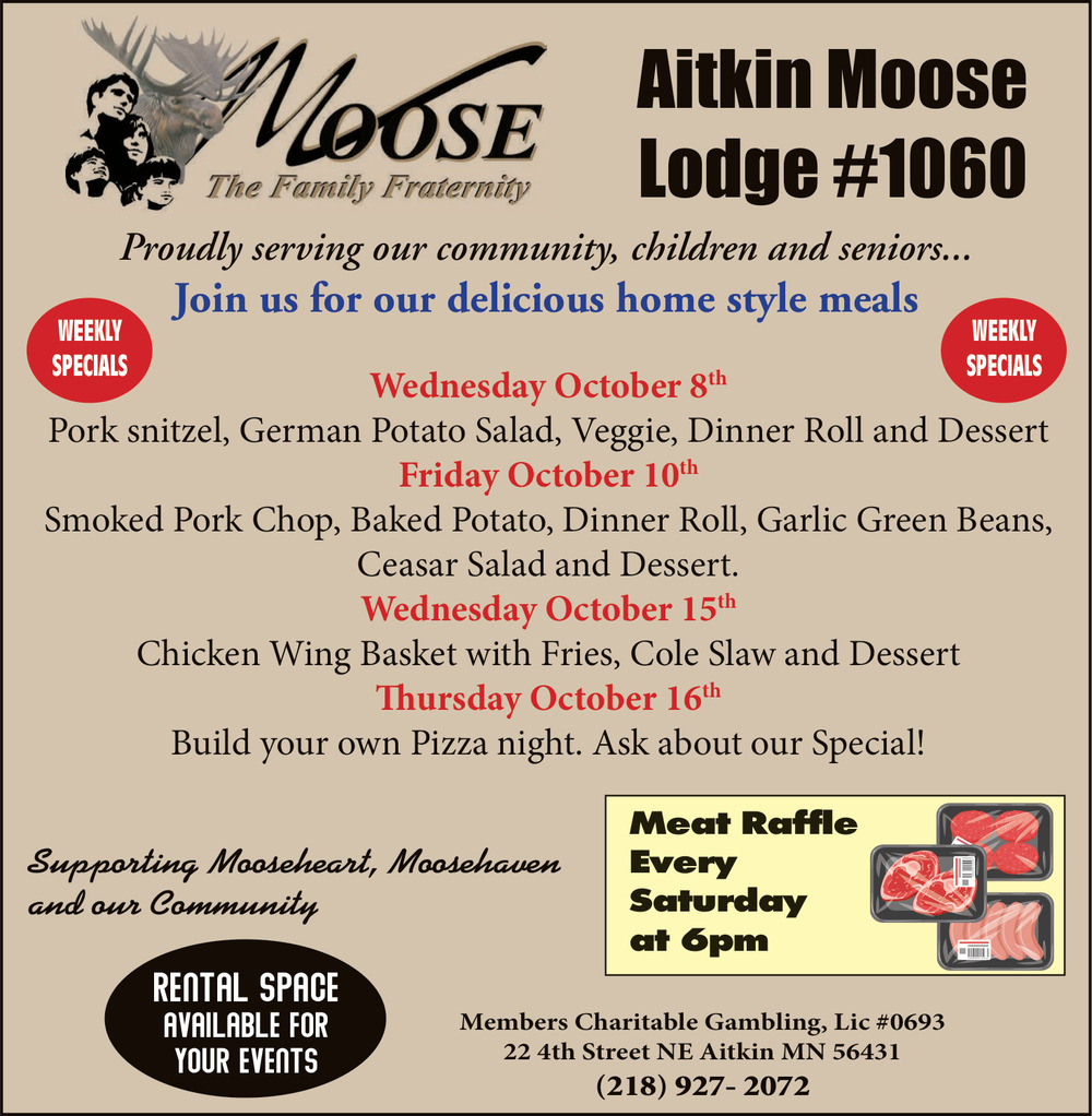 Oct 04, 2025. Aitkin Moose Lodge Restaurant Ads from Aitkin Independent Age