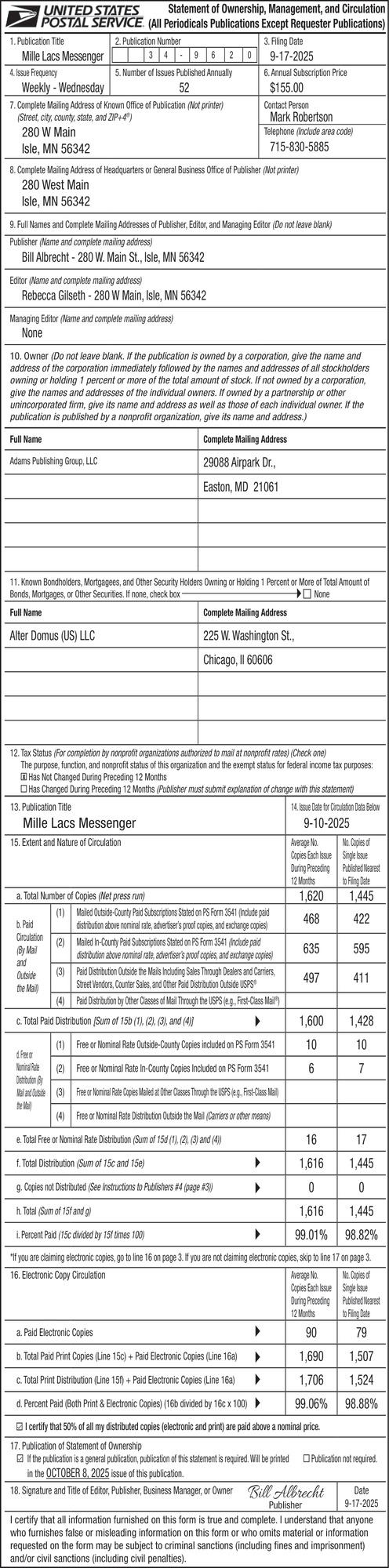 Oct 08, 2025. United States Postal Service Print & Advertising Ads from Mille Lacs Messenger