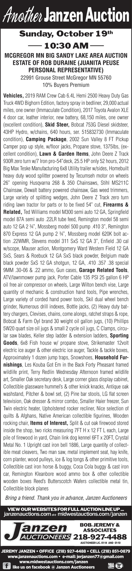 Oct 11, 2025. Janzen Auctioneers Auction Ads from Mille Lacs Messenger