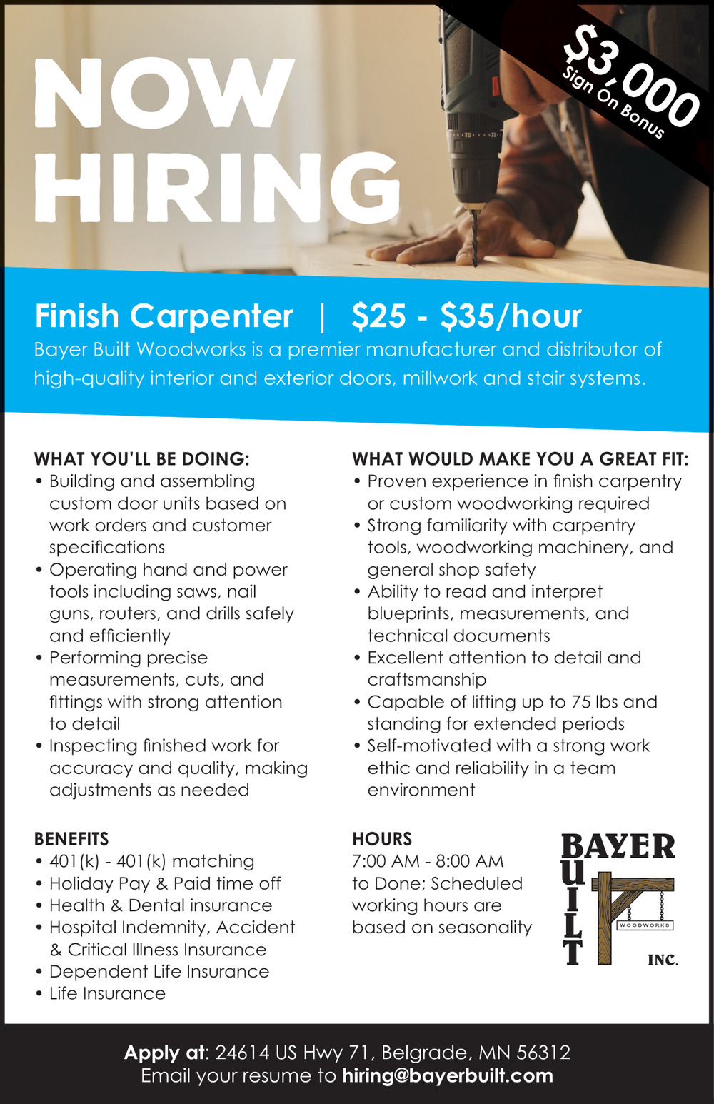Oct 12, 2025. Bayer Built, Inc Jobs Ads from Mille Lacs Messenger