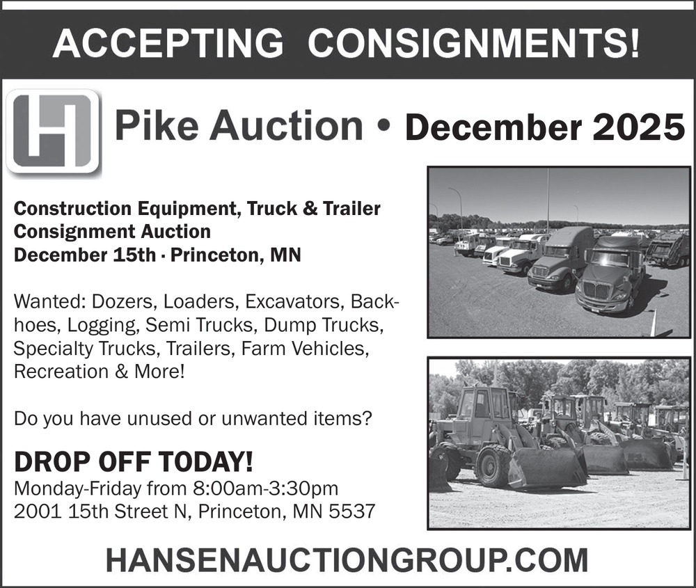 Nov 08, 2025. Pike Auction Company Auction Ads from Mille Lacs Messenger