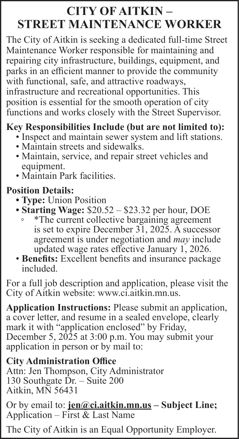 Nov 19, 2025. City of Aitkin Jobs Ads from Mille Lacs Messenger