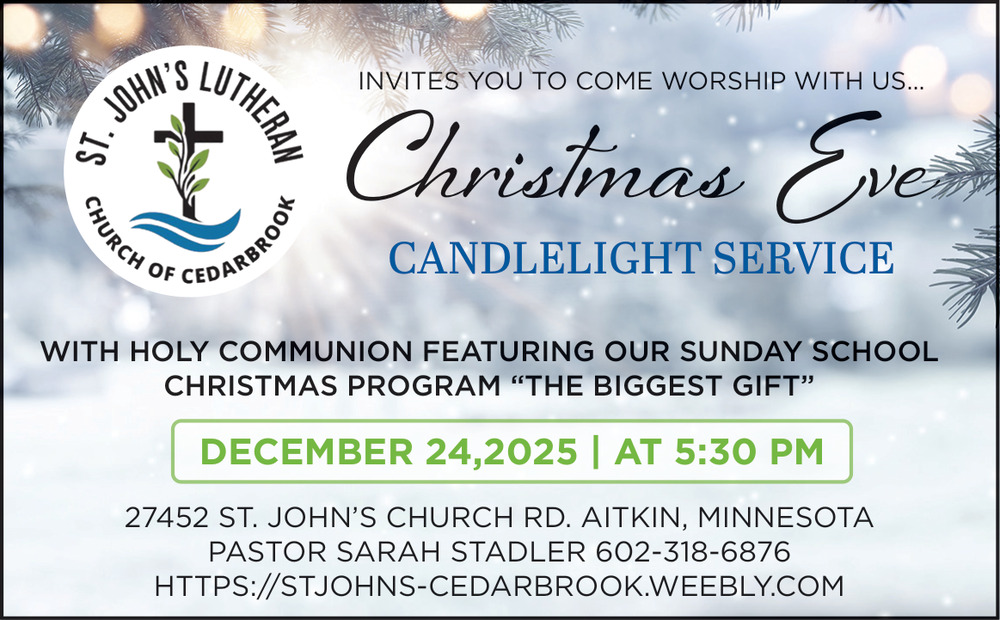 Dec 10, 2025. St. John's Lutheran Cedarbrook & Bethesda-Rossburg Church Ads from Mille Lacs Messenger