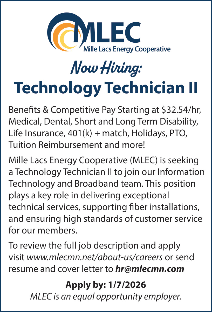 Dec 17, 2025. MLEC - Mille Lacs Energy Cooperative Jobs Ads from Aitkin Independent Age