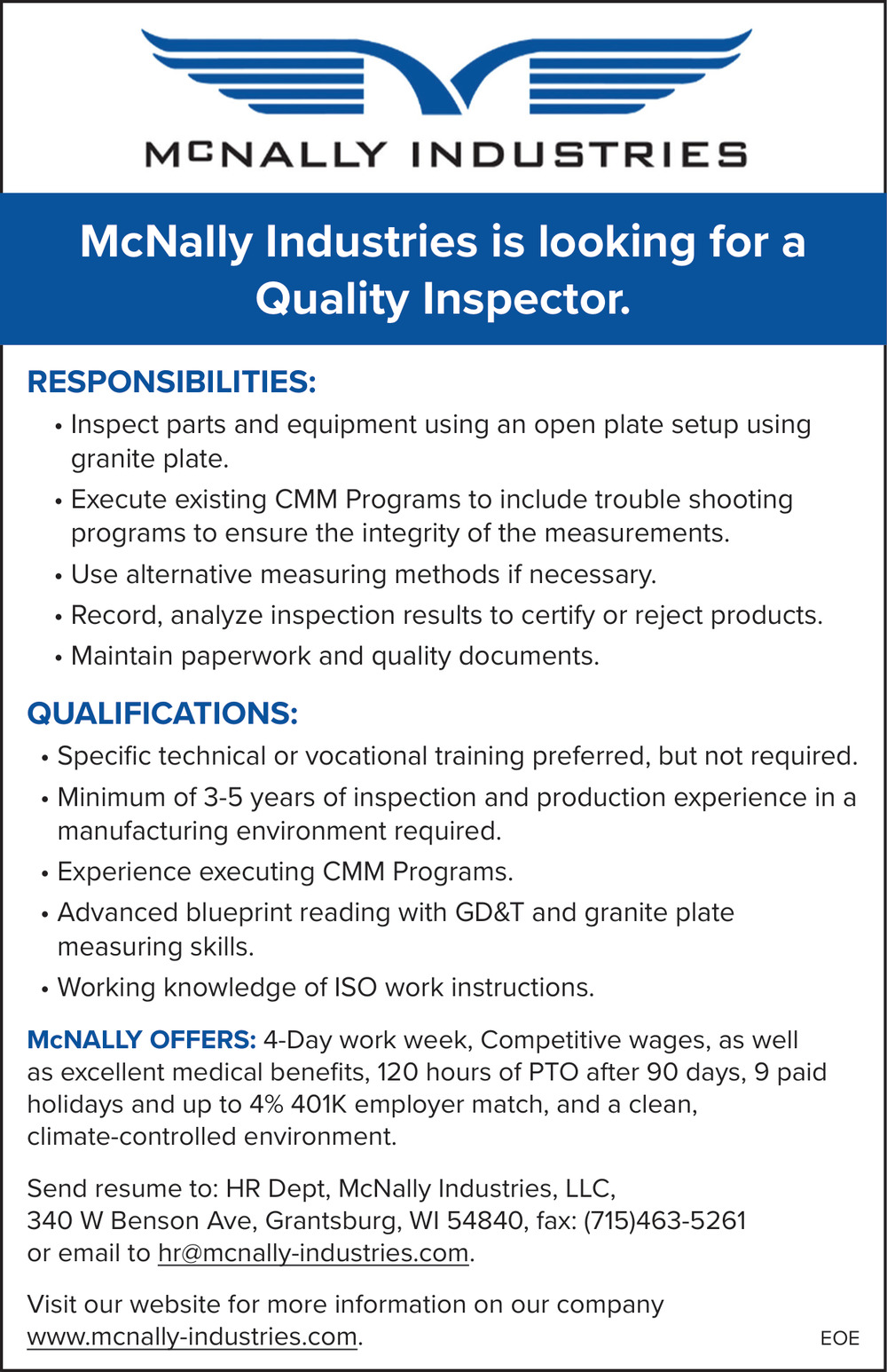 Dec 20, 2025. Mcnally Industries Jobs Ads from Mille Lacs Messenger