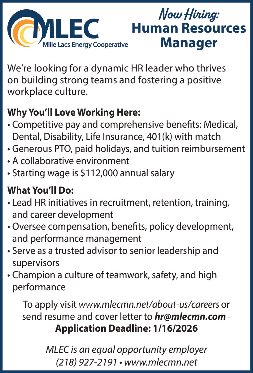 Jan 07, 2026. MLEC - Mille Lacs Energy Cooperative Jobs Ads from Mille Lacs Messenger