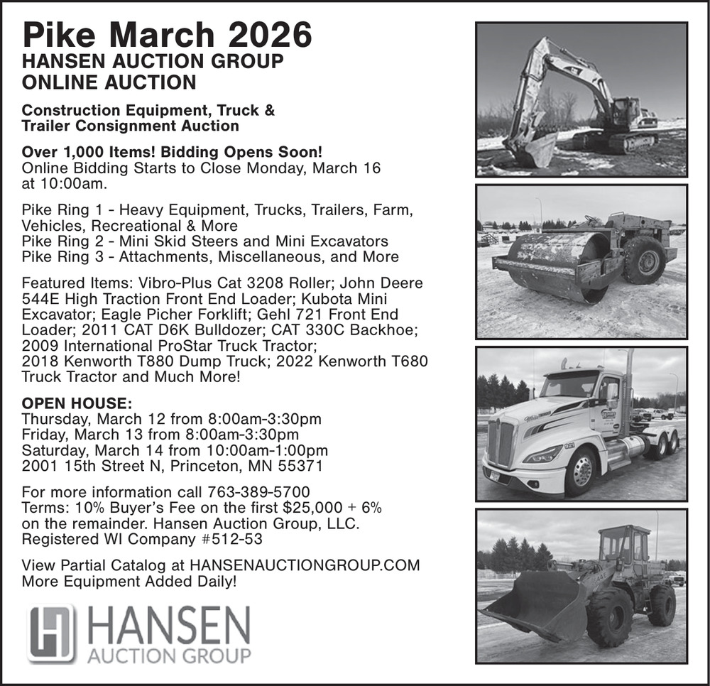 Mar 07, 2026. Hansen Auction Group Auction Ads from Aitkin Independent Age