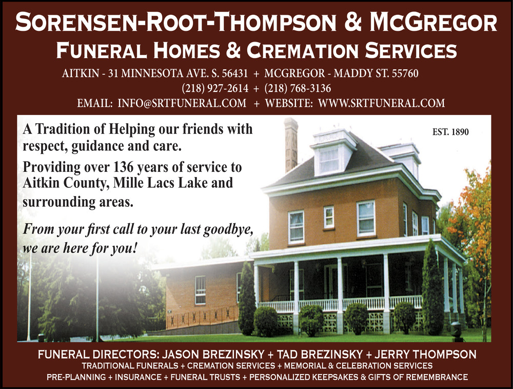 Mar 25, 2026. SRT Sorensen-Root-Thompson Funeral Ads from Aitkin Independent Age