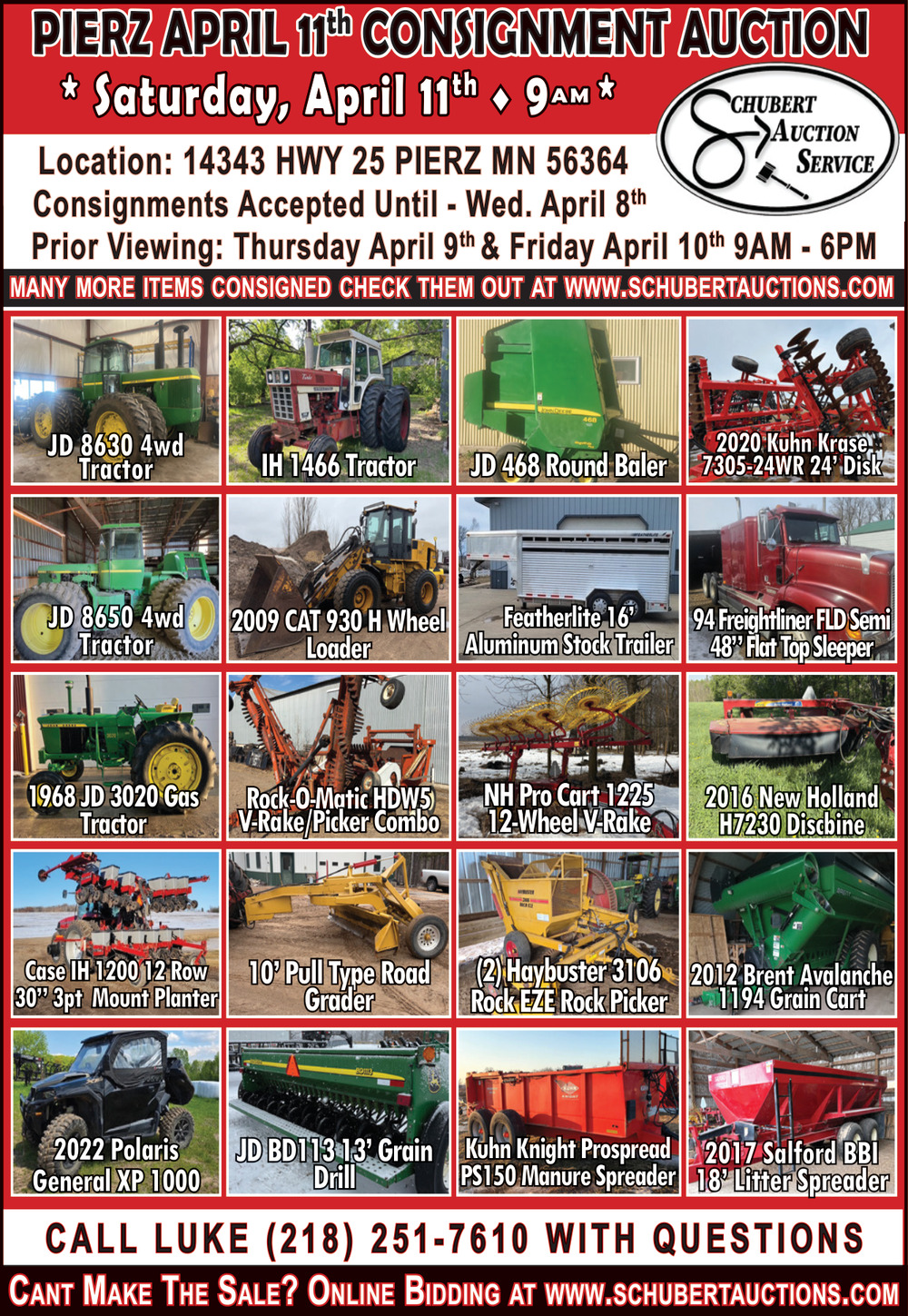 Apr 01, 2026. Schubert Auction Service Auction Ads from Aitkin Independent Age