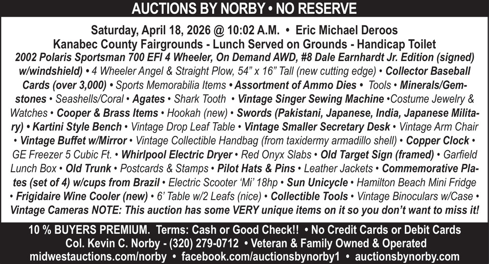 Apr 11, 2026. Auctions by Robyn & Norby Auction Ads from Aitkin Independent Age