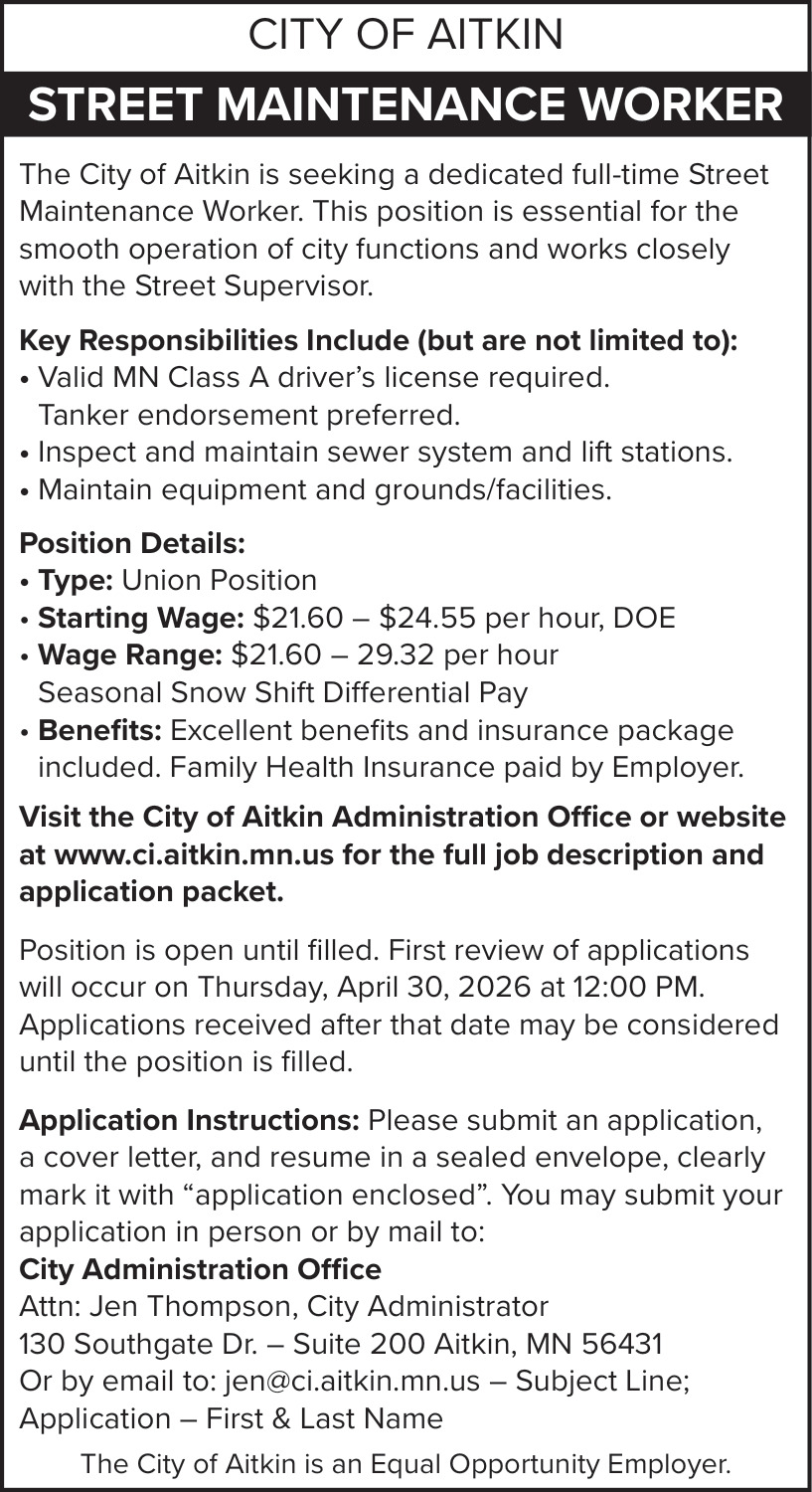 Apr 18, 2026. City of Aitkin Jobs Ads from Mille Lacs Messenger